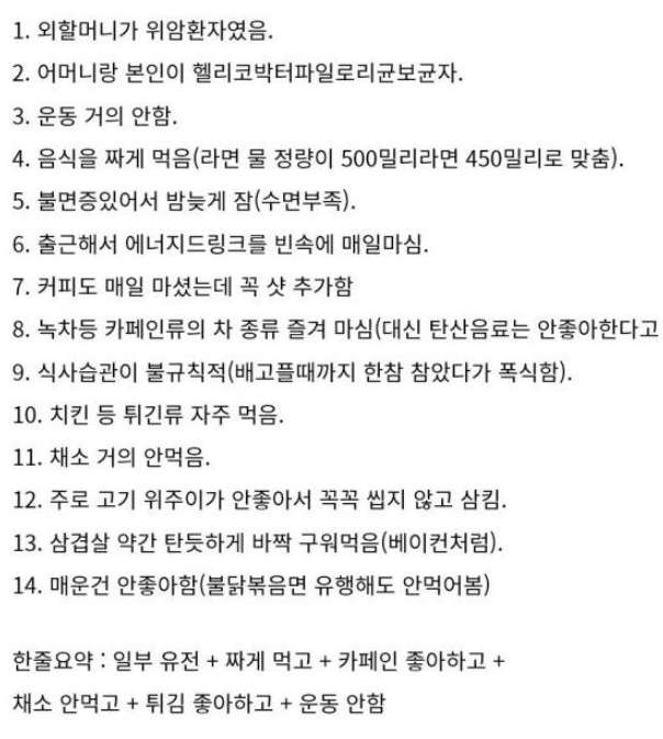유전적 요인: 가족 중에 위암 환자가 있는 경우 위암 발생 위험이 다소 증가할 수 있습니다.